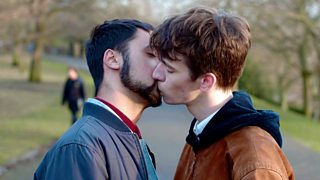 Two men hold hands in a public place but, even in 2018, something’s not quite right.