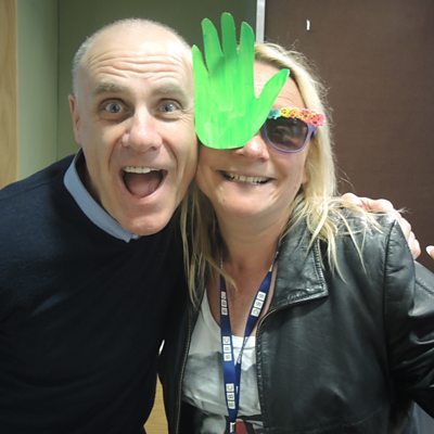 Lynn Parsons explains to Steve Wright why she's wearing a pair of strange sunglasses