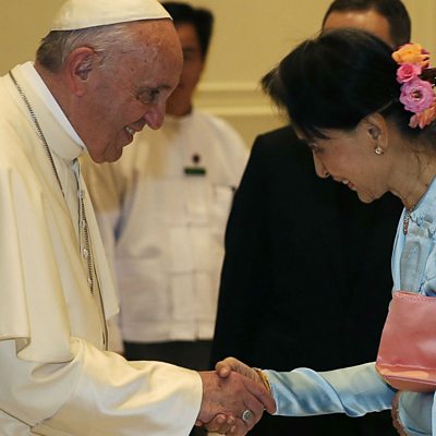 Pope Francis has given a keynote speech in Myanmar, demanding "respect for each ethnic group," but he did not refer specifically to its Muslim Rohingya community. Rights groups had urged the Pope to use the term. The 成人快手's Asia Pacific Editor, Celia Hatton, explains why the use of the term 'Rohingya' is controversial. (Photo: Pope Francis (L) shakes hands with Myanmars civilian leader Aung San Suu Kyi (R) during their meeting in Naypyidaw on November 28, 2017, Credit: Max Rossi/AFP/Getty Images)