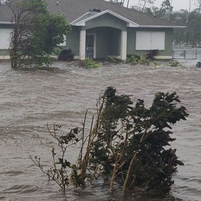 As Hurricane Dorian continues to inflict damage across the Bahamas chain of Caribbean islands, a local building contractor is doing what he can to rescue people. DeSean Smith is on Grand Bahama where his own house has been flooded and he is taking shelter with his family at his in-laws. But when he heard there were other people still stranded, he went back out into the storm on his jet-ski to try to help. (Picture: Flooding in a residential street on Grand Bahama; Credit: Rob Oluwa)