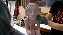 Puerto Rican artist Miguel Luciano has taken the discussion a step forward by 3D modelling a 1,000-year-old wooden devotional statue from the Rockefeller collection. He's not for taking it back, but for re-contextualising an object designed to be handled. We are with him as he unveils it to veteran social photographer Hiram Maristany. Luciano is working on a Met programme that aims to use artefacts to build links with communities who might feel that the museum, and its collections, have little to say to them.