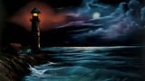 18/52 Bob Ross creates a night scene with waves crashing against rocks and a lighthouse.
