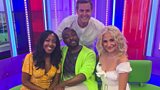 Pixie Lott and will.i.am are on the sofa with Matt Baker and Angellica Bell.