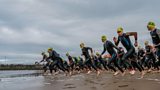 Mae Triathlon Porthcawl yn dechrau gyda nofiad yn y m么r, wedyn cwrs beic heriol 40 cilo... (A)