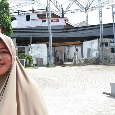 2004 Indian Ocean tsunami: 10 years on, Matthew Bannister hears tales of loss, and extraordinary survival, from the Indonesian city of Banda Aceh. Fauziah Basyariah lost her husband and parents in the 2004 Indian Ocean tsunami. But she and her children were saved by a fishing boat that was washed inland by the huge wave and came to rest on top of a house. Today the boat is still there, and Fauziah supports her family by making dried fish products, called "tsunami", which carry a photo of the boat that saved her life. Reporter Candida Beveridge went to the village of Lampulo to see her, and the boat. Picture: Fauziah Basyariah with the boat that saved her life in the 2004 tsunami Picture credit: Candida Beveridge