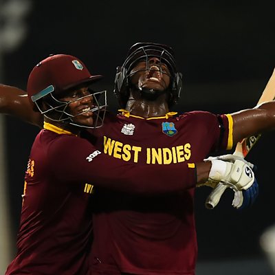 Carlos Brathwaite relives the final over that clinched the World T20 for the West Indies. He also pays tribute to team-mate Marlon Samuels, who's unbeaten 85 helped to guide West Indies to the title. (Image: Carlos Brathwaite and Marlon Samuels celebrate World T20 glory for the West Indies. Credit: Getty Images)