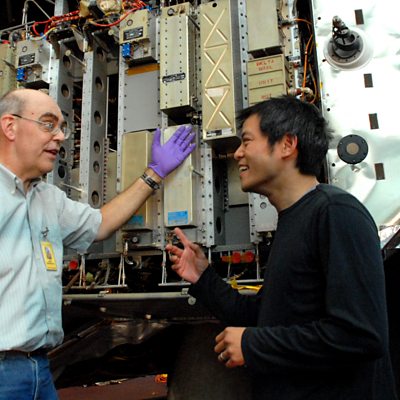 Paul Fjeld explains to Dr Kevin Fong how Neil Armstrong landed on the moon (Photo: Kevin and Paul next to the lunar module. Credit: 成人快手)