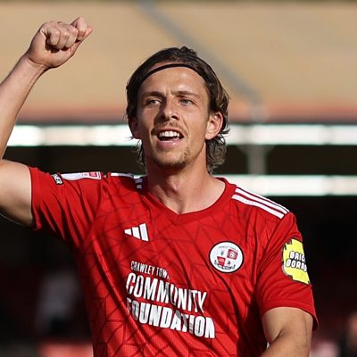 Gary Smith speaks to Crawley striker Danilo Orsi as they make the play-off in League Two.